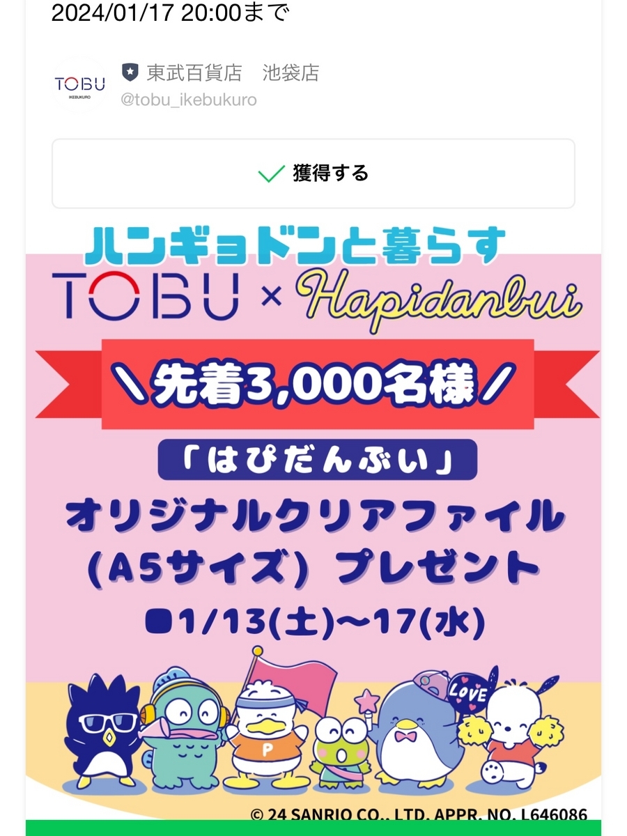 なんと1/13(土)〜1/17(水)の期間限定&なくなりしだい終了ではあるものの、東武の公式LINEでとお友達になるだけで無料のクリアファイルが頂けるとの事で、こちらもありがたく頂戴します。